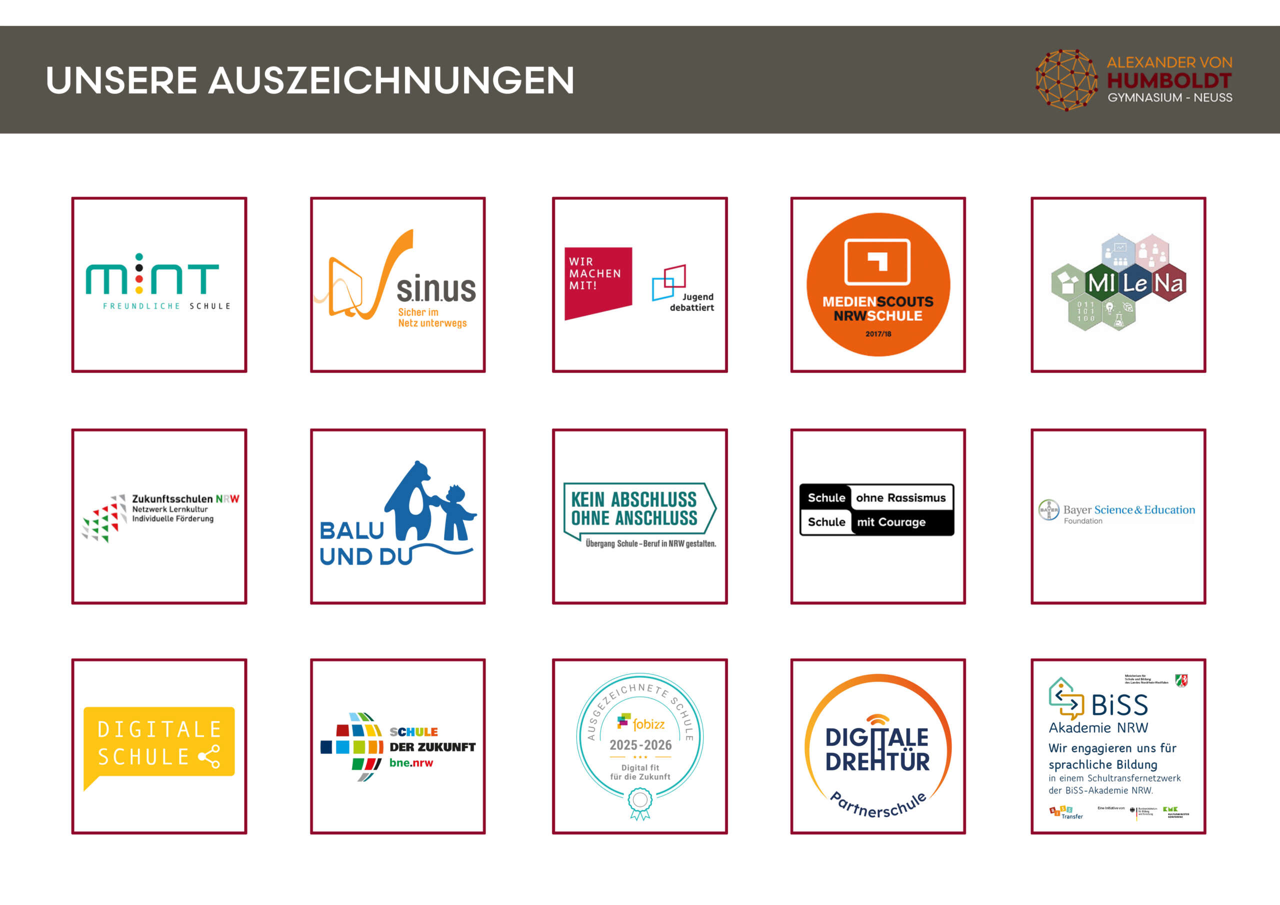 — ELTERNINFORMATIONEN — Hier veröffentlichen wir fortlaufend die aktuellen Informationen für Sie, z.B. alle Elternbriefe und aktuelle Hinweise. Alle Termine News Brieffreundschaft – der Start einer Freundschaft 59 Minuten ago Wettbewerbe News Im Düsseldorer Rathaus: Regionalwettbewerb Jugend debattiert – wir machen mit! 2 Tagen ago News Spannende Einblicke in die Forschung und Entwicklung 09.02.2026 News Die Poesiepause: Künstler*innen des Wortes stören den Unterricht! 27.01.2026 Ankündigung News 10-jähriges Jubiläum am Humboldt: Wir feiern den deutsch-französischen Tag am 22.01.! 18.01.2026 News Bienvenue à Neuss! 18.01.2026 Alle News ZUR SCHÜLERZEITUNG Newsletter Bleiben Sie immer auf dem Laufenden und abonnieren Sie unseren AvH Newsletter!Newsletter bestellen