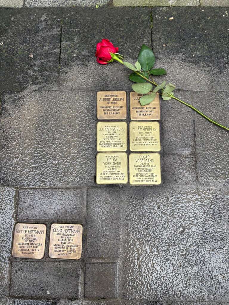 Damit sind wir nicht allein: Auch andere Schulen in Neuss haben sich in dieser Woche mit uns engagiert. Das Erzbischöfliche Gymnasium Marienberg und die Emmy-Noether-Gesamtschule haben Stolpersteinpatenschaften für die Neusser Familie Mendel übernommen.