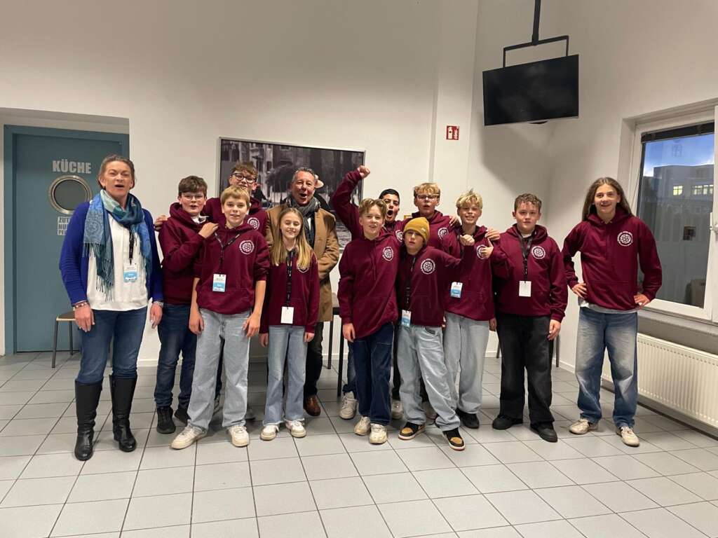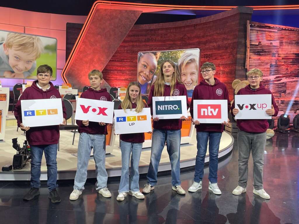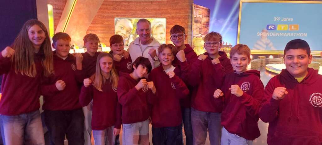 Für 11 Schülerinnen und Schüler der 8d ging es am 20.11. nach Köln-Hürth in die Studios von RTL – um stolze € 2.100 an Wolfram Kons für die RTL-Stiftung ,,Wir helfen Kindern“ zu übergeben. Mit dem Betrag, der sich aus Spenden aus Kuchenverkäufen der 8d und Spenden der Schulgemeinschaft zusammensetzt, wird der Bau einer Kinderaugenklinik in Kenia unterstützt. Dieses ist nur eines von unzähligen Projekten, für die die Stiftung u.a. den Spendenmarathon veranstaltet.