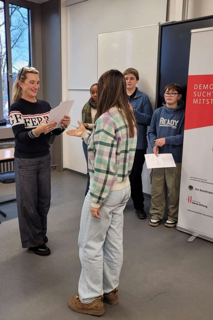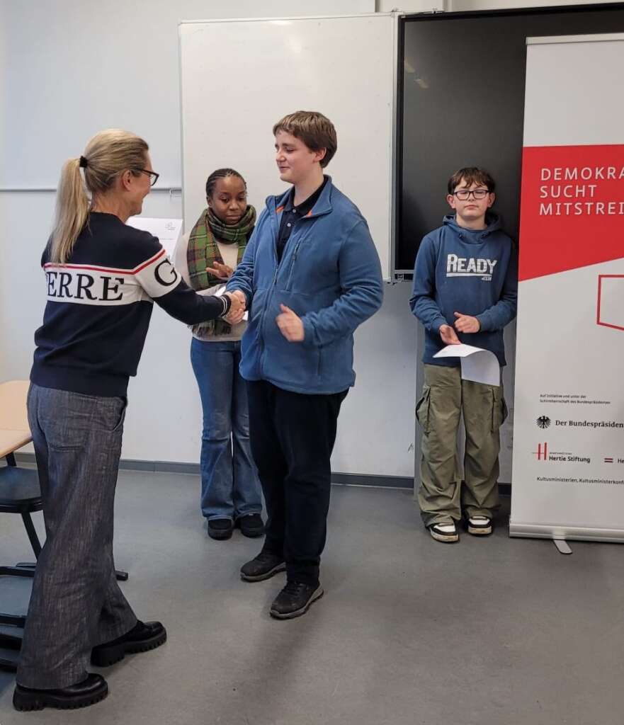 Die Finalisten sind Max (Jahrgang 9, 1.Platz), Jakob (Jahrgang 8, 2.Platz), Aline und Carla (beide aus dem Jahrgang 8, 3. und 4.Platz). Sie werden unsere Schule auf dem Regionalwettbewerb im Düsseldorfer Rathaus vertreten. Wir gratulieren herzlich! 🙂