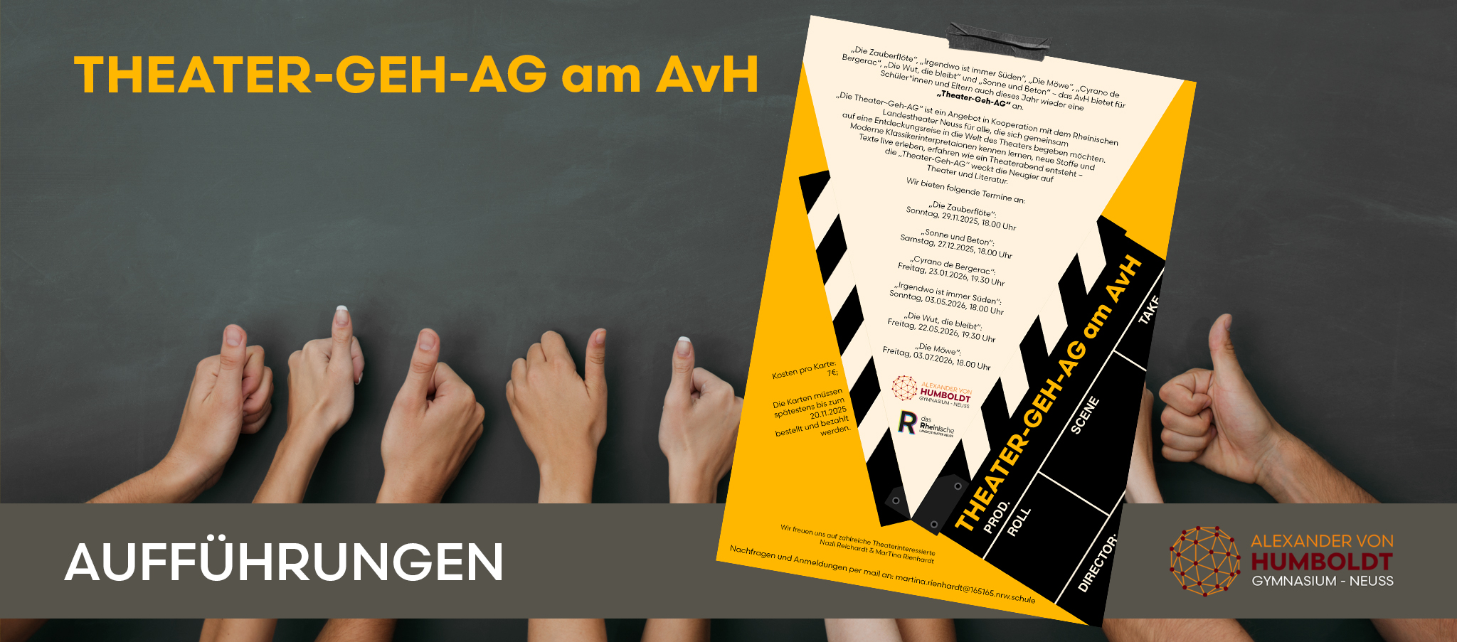 × – TAG DER OFFENEN TÜR – — ELTERNINFORMATIONEN — Hier veröffentlichen wir fortlaufend die aktuellen Informationen für Sie, z.B. alle Elternbriefe und aktuelle Hinweise. Alle Termine Förderverein Ankündigung News Neusser Weihnachtsmarkt 21 Stunden ago Wettbewerbe Ausgezeichnet! News Humboldt-Schüler kraulen für die Abikasse 21 Stunden ago News World Clean Up Days – Clean-Up! 3 Tagen ago Ankündigung News Lust auf Theater? Die Theater-Geh-AG lädt ein! 09.11.2025 Wettbewerbe Ausgezeichnet! News Glücklich und stolz! 09.10.2025 News Umgang mit ChatGPT & Co an Schulen 28.09.2025 Alle News ZUR SCHÜLERZEITUNG Newsletter Bleiben Sie immer auf dem Laufenden und abonnieren Sie unseren AvH Newsletter!Newsletter bestellen