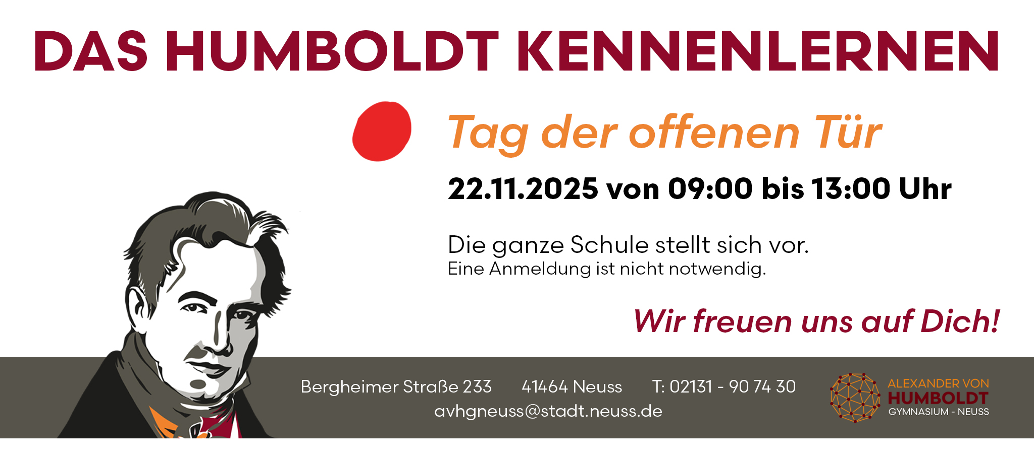× — ELTERNINFORMATIONEN — Hier veröffentlichen wir fortlaufend die aktuellen Informationen für Sie, z.B. alle Elternbriefe und aktuelle Hinweise. Alle Termine Wettbewerbe Ausgezeichnet! News Glücklich und stolz! 09.10.2025 News Umgang mit ChatGPT & Co an Schulen 28.09.2025 Förderverein News Jubiläumsfeier: 10-Jahre SE-Klasse und Einweihung der Freundschaftsbank im Rahmen der Neusser Interkulturellen Woche 27.09.2025 News Wie werden Jugendliche, die aus ihren Heimatländern flüchten mussten, unterrichtet? Wir feiern das 10-jährige Jubiläum der ,,Seiteneinsteiger-Klasse“! 27.09.2025 News Französisch zum Anbeißen! 27.09.2025 News Wir stellen vor: Bruno – unser Schulhund 24.09.2025 Alle News ZUR SCHÜLERZEITUNG Newsletter Bleiben Sie immer auf dem Laufenden und abonnieren Sie unseren AvH Newsletter!Newsletter bestellen