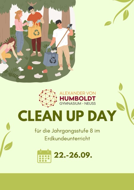 Im September führte die 8. Jahrgangsstufe anlässlich des World Clean Up Days ein Clean-Up im Schulumfeld des AvH durch. Ausgestattet wurden wir hierbei mit Handschuhen, Zangen und Müllsäcken von der AWL Neuss. Die Klassen waren im Reuschenberger Wald und im direkten Schulumfeld unterwegs – sie fanden allerlei Müll, der achtlos weggeworfen wurde.